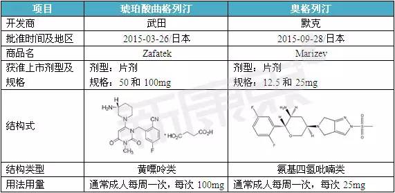 DPP-Ⅳ抑制劑通過(guò)抑制腸促胰素的DPP-Ⅳ酶的活性而發(fā)揮作用,其通過(guò)競(jìng)爭(zhēng)性結(jié)合DPP-Ⅳ活性部位,降低DPP-Ⅳ的催化活性,抑制GLP-1的降解,從而增加血液中GLP-1的濃度。DPP-Ⅳ抑制劑因降糖效果強(qiáng),且可保護(hù)胰島功能,安全性良好而倍受臨床青睞。然而,最近發(fā)展起來(lái)的長(zhǎng)效口服DPP-Ⅳ抑制劑,由于每周僅需給藥1次而提高了患者的便利性和依從性,其臨床價(jià)值和臨床地位或?qū)⒂型嵘1M管口服降糖藥林林總總,但長(zhǎng)效口服DPP-Ⅳ抑制劑將以其獨(dú)特的優(yōu)勢(shì)有望在競(jìng)爭(zhēng)激烈的口服降糖藥市場(chǎng)中突飛猛進(jìn)。迄今為止,已有兩個(gè)長(zhǎng)效口服DPP-Ⅳ抑制劑應(yīng)用于臨床,這兩個(gè)藥物分別是于2015年3月26日和2015年9月28日獲日本醫(yī)藥品與醫(yī)療器械綜管理局(PMDA)批準(zhǔn)的琥珀酸曲格列?。═relagliptin Succinate,SYR-472)和奧格列?。?Omarigliptin,MK-3102)(有關(guān)這兩個(gè)產(chǎn)品的基本信息詳見(jiàn)表1)。盡管上述這兩個(gè)產(chǎn)品均尚未在歐美等主流國(guó)家或地區(qū)上市,但曲格列汀和奧格列汀已在日本開(kāi)展一場(chǎng)PK大賽,孰將于這場(chǎng)PK大賽中奪冠我們拭目以待。