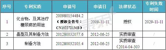 經(jīng)對(duì)表2數(shù)據(jù)分析可知:武田共在中國(guó)申請(qǐng)了19項(xiàng)與曲格列汀相關(guān)的專利,目前有3項(xiàng)獲得授權(quán),上述3項(xiàng)授權(quán)專利覆蓋了單方制劑,復(fù)方制劑(聯(lián)合用藥)和晶型的制備。其中,要求保護(hù)的琥珀酸曲格列汀A晶型的制備方法的專利CN101573351B將于2027年11月29日到期;要求保護(hù)的單方制劑專利CN101374523B將于2026年9月13日到期;要求保護(hù)曲格列汀或其鹽與吡格列酮或伏格列波糖聯(lián)合用藥的制劑專利CN101389339B則將于2026年12月27日到期。