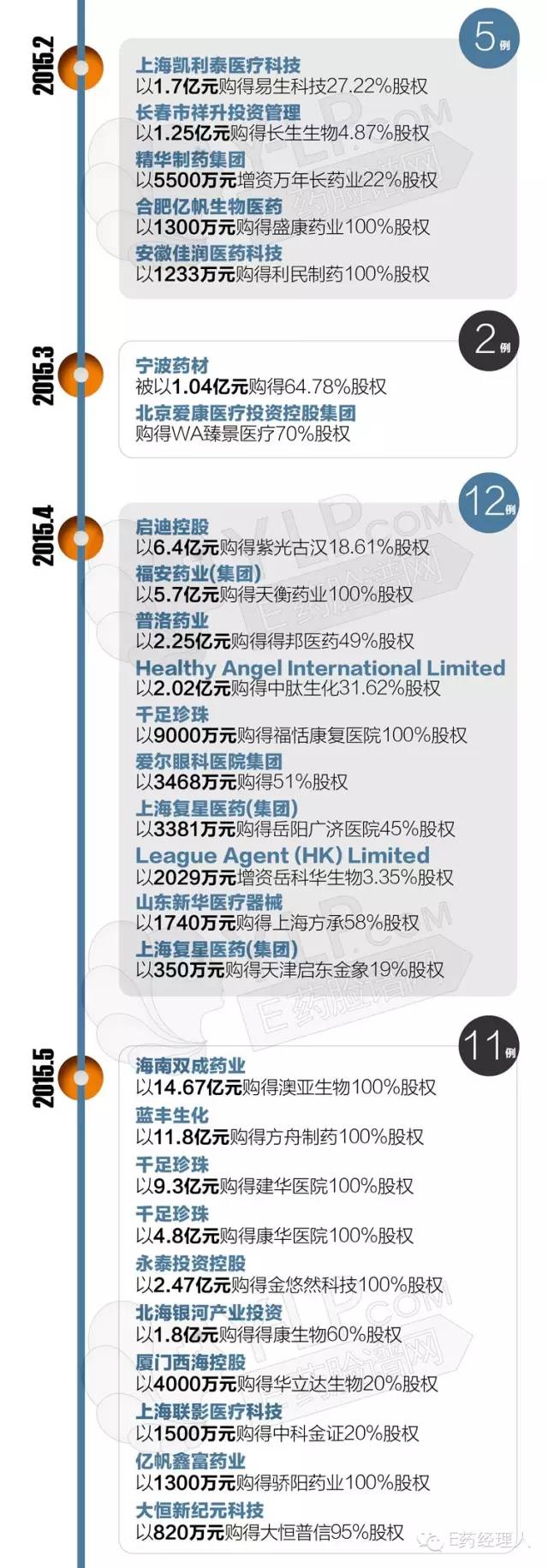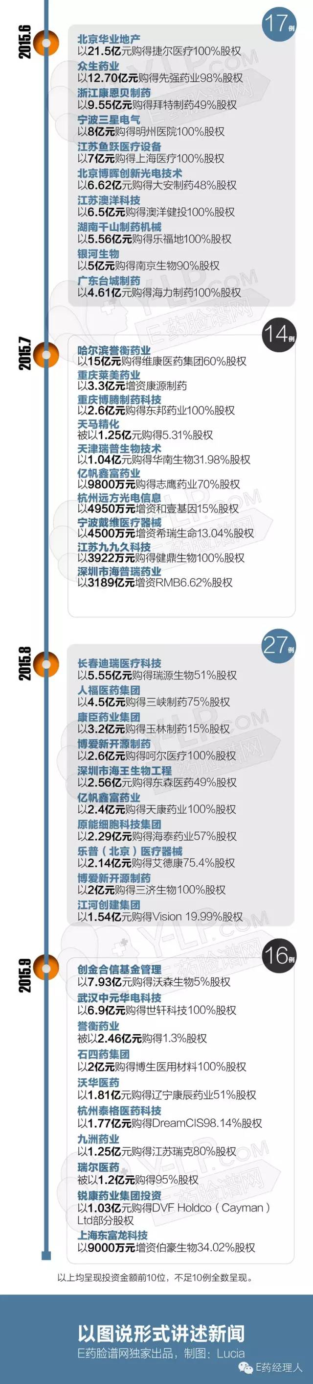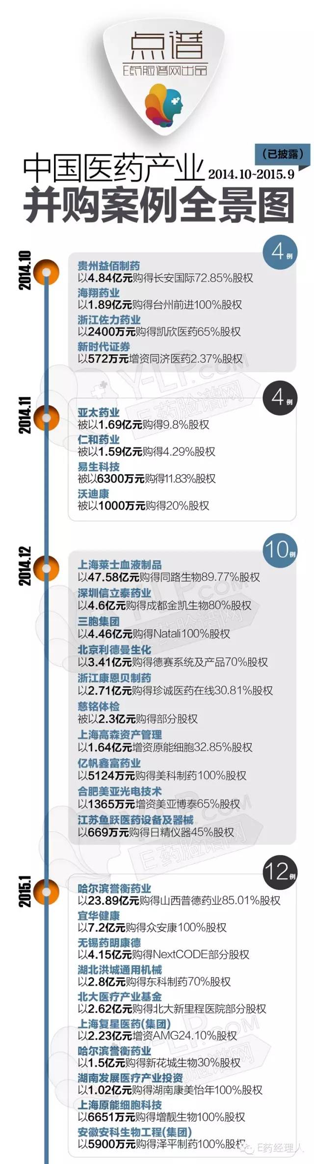 2014年10月-2015年9月,中國醫(yī)藥產(chǎn)業(yè)共披露134起并購案例。其中,2014年10月有4例,2014年11月有4例,2014年11月有10例,2015年1月有12例……具體如下圖所示: