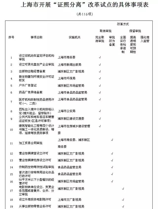 開展“證照分離”改革試點,是推進簡政放權(quán)、放管結(jié)合、優(yōu)化服務(wù)的重要舉措,主要解決“先照后證”后市場主體辦證難的問題。通過采取改革審批方式和加強綜合監(jiān)管,進一步完善市場準入,使企業(yè)辦證更加便捷高效。對企業(yè)能夠自主決策的經(jīng)營活動,取消行政審批,或改為備案管理;對暫時不能取消審批的行政許可,簡化審批方式,實行告知承諾制;對不適合采取告知承諾制的行政許可事項,簡化辦事流程,公開辦事程序,提高審批的透明度和可預(yù)期性;對涉及國家安全、公共安全等特定領(lǐng)域,繼續(xù)強化市場準入管理,加強風險防范。進一步探索加強事中事后監(jiān)管的有效方式和措施,建立綜合監(jiān)管體系,切實增強監(jiān)管合力,提升監(jiān)管效能。按照易操作、可管理的要求,從與企業(yè)經(jīng)營活動密切相關(guān)的行政許可事項中,選擇審批頻次比較高、改革后效果比較明顯的116項行政許可事項(詳見附表),先行開展改革試驗。根據(jù)行政許可事項的不同情況,分類推進,深入試點。(一) 取消審批。對市場競爭機制能夠有效調(diào)節(jié),行業(yè)組織或中介機構(gòu)能夠有效實現(xiàn)行業(yè)自律管理的事項,取消行政審批,實行行業(yè)自律管理,允許企業(yè)直接開展相關(guān)經(jīng)營活動。包括設(shè)立可錄光盤生產(chǎn)企業(yè)審批等10項行政許可事項。(二) 取消審批,改為備案。政府為及時、準確地獲得相關(guān)信息,更好地開展行業(yè)引導(dǎo)、制定產(chǎn)業(yè)政策和維護公共利益,對行政許可事項實行備案管理。根據(jù)規(guī)定的備案條件,企業(yè)將相關(guān)材料報送政府有關(guān)部門后,即可開展相關(guān)經(jīng)營活動;發(fā)現(xiàn)企業(yè)有違法違規(guī)行為,通過加強事中事后監(jiān)管,予以糾正或處罰。政府部門不對備案材料進行核準或許可。包括加工貿(mào)易合同審批等6項行政許可事項。(三) 簡化審批,實行告知承諾制。對暫時不能取消審批,但通過事中事后監(jiān)管能夠糾正不符合審批條件的行為且不會產(chǎn)生嚴重后果的行政許可事項,實行告知承諾制。對實行告知承諾的行政許可事項,由行政審批機關(guān)制作告知承諾書,并向申請人提供示范文本,一次性告知企業(yè)審批條件和需要提交的材料,企業(yè)承諾符合審批條件并提交有關(guān)材料,即可當場辦理相關(guān)行政許可事項。申請人達到法定許可條件后,方可從事被許可行為。包括機動車維修經(jīng)營許可等26項行政許可事項。(四) 提高審批的透明度和可預(yù)期性。對暫時不能取消審批,也不適合采取告知承諾制的行政許可事項,簡化辦事流程,公開辦事程序,推進標準化管理和網(wǎng)上辦理,明確審批標準和辦理時限,以最大程度減少審批的自由裁量權(quán),實現(xiàn)辦理過程公開透明、辦理結(jié)果有明確預(yù)期。包括會計師事務(wù)所及其分支機構(gòu)設(shè)立審批等41項行政許可事項。(五) 對涉及公共安全等特定活動,加強市場準入管理。對直接涉及國家安全、公共安全、生態(tài)環(huán)境保護以及直接關(guān)系人身健康、生命財產(chǎn)安全等特定活動的行政許可事項,按照國際通行規(guī)則,加強風險控制,強化市場準入管理。包括設(shè)立經(jīng)營性互聯(lián)網(wǎng)文化單位審批等33項行政許可事項。(一) 以信息互聯(lián)共享為基礎(chǔ),實施協(xié)同監(jiān)管。厘清政府有關(guān)部門市場監(jiān)管職責,建立登記注冊、行政審批、行業(yè)主管相互銜接的市場監(jiān)管機制,推進實施“雙告知”、“雙隨機”抽查等制度。建立市場監(jiān)管信息互聯(lián)共享機制,推進信息交流和資源共享,實現(xiàn)工商部門、審批部門、行業(yè)主管部門以及其他部門之間的信息實時傳遞和無障礙交換。加強跨部門聯(lián)動響應(yīng),形成“一處違法、處處受限”的聯(lián)合懲戒機制。推進統(tǒng)一市場監(jiān)管和綜合執(zhí)法模式,整合監(jiān)管部門,減少監(jiān)管層級,提高監(jiān)管效能。(二) 以誠信管理為手段,實施分類監(jiān)管。加快公共信用信息平臺的建設(shè)和應(yīng)用,建立行政審批誠信檔案制度,依據(jù)監(jiān)管對象的日常經(jīng)營活動、信用評價信息等誠信情況,將監(jiān)管對象分為不同類別,建立相應(yīng)的激勵機制、預(yù)警機制和懲戒機制。健全企業(yè)信息公示制度和公示信息抽查制度,完善企業(yè)經(jīng)營異常名錄制度和嚴重違法企業(yè)“黑名單”制度。完善失信信息記錄和披露制度,加強對失信單位和人員的監(jiān)督,加大違法違規(guī)行為懲戒力度,視情況實施吊銷營業(yè)執(zhí)照、吊銷注銷撤銷許可證、列入經(jīng)營異常名錄和“黑名單”等懲戒措施。(三) 以行業(yè)協(xié)會商會為依托,實施自律監(jiān)管。積極引導(dǎo)市場主體自治自律,推進行業(yè)自律,促進市場主體自我約束、誠信經(jīng)營,共同維護公平競爭的市場秩序。積極發(fā)揮行業(yè)協(xié)會商會作用,鼓勵行業(yè)協(xié)會商會制訂行規(guī)行約和行業(yè)內(nèi)爭議處理規(guī)則,制定發(fā)布產(chǎn)品和服務(wù)社會團體標準。支持行業(yè)協(xié)會商會監(jiān)督會員遵守行業(yè)自律規(guī)范、公約和職業(yè)道德準則。(四) 以社會力量參與