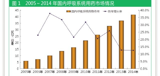 據國內22個城市樣本醫(yī)院數據,國內呼吸系統(tǒng)用藥市場規(guī)模從2005年的6.0億元增長到2014年的41.6億元,2005~2014年購藥金額復合增長率為24.1%。國內用藥金額比例逐年上升,9年整體市場增長7倍。