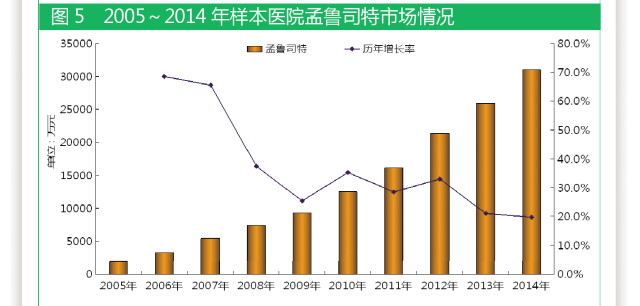 據國內22個城市樣本醫(yī)院數據,2005~2014年,孟魯司特一直保持快速增長態(tài)勢。2014年,該產品在呼吸系統(tǒng)用藥領域銷售額排名第三位,年復合增長率高達36.2%。2005年,樣本醫(yī)院孟魯司特用藥金額為1926萬元,2014年用藥金額達3.1億元,9年整體市場增長16.1倍。2005~2014年增長率保持在30.0%以上,增長速度十分惹眼。