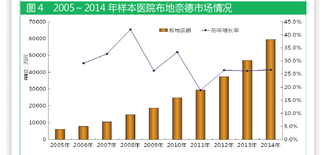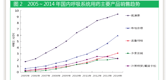 據國內22個城市樣本醫(yī)院數據,2005~2014年,布地奈德一直保持快速增長態(tài)勢。2005年以來,該產品在呼吸系統(tǒng)用藥領域銷售額排名第二位,年復合增長率為28.9%。2005年,樣本醫(yī)院布地奈德用藥金額為6045萬元;2014年,用藥金額達6.0億元;9年整體市場增長9.8倍。自2005年起,阿斯利康一直穩(wěn)居國內哮喘用藥龍頭位置,這主要得益于普米克系列品牌的貢獻。