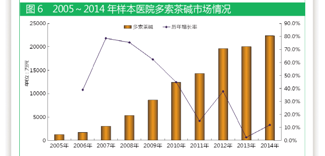 據國內22個城市樣本醫(yī)院數據,2005~2014年,氨溴索一直保持較快增長速度。自2005年以來,該產品在呼吸系統(tǒng)用藥領域銷售額一直名列前茅,年復合增長率為20.9%。2005年樣本醫(yī)院氨溴索用藥金額為1.7億元,2014年用藥金額達9.4億元,9年整體市場增長5.5倍。