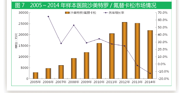 據國內22個城市樣本醫(yī)院數據,2005~2012年,復方沙美特羅/氟替卡松一直保持較快增長態(tài)勢,但進入2013年以來,該產品趨于下降趨勢,并連續(xù)兩年出現(xiàn)負增長。2014年,該產品在呼吸系統(tǒng)用藥領域銷售額排名第五位,年復合增長率25.3%。2005年,樣本醫(yī)院沙美特羅/氟替卡松用藥金額為2886萬元,2014年用藥金額達2.2億元,9年整體市場增長7.6倍,市場下降明顯。