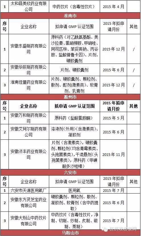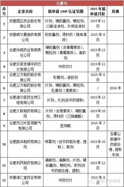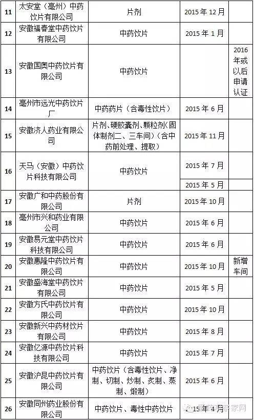 安徽省局要求加大對藥品生產(chǎn)企業(yè)的監(jiān)督檢查力度,確保未通過新修訂藥品GMP認證的藥品生產(chǎn)企業(yè)、車間和生產(chǎn)線自2016年1月1日起一律停止藥品生產(chǎn),逐一進行現(xiàn)場檢查,確認其保持停產(chǎn)狀態(tài);一旦發(fā)現(xiàn)未按規(guī)定停產(chǎn)的,按照《中華人民共和國藥品管理法》及相關規(guī)定嚴肅查處;對停產(chǎn)企業(yè)的原輔材料、包裝材料等進行登記并采取切實有效的管控措施,對特殊藥品應嚴格監(jiān)管到位,嚴防流弊。從表格統(tǒng)計得知,此次停產(chǎn)的藥品生產(chǎn)企業(yè)包括安徽國正藥業(yè)股份有限公司、安徽威爾曼制藥有限公司、合肥華威藥業(yè)有限責任公司等75家,認證范圍涵蓋等片劑、硬膠囊劑、顆粒劑、口服溶液劑、外用溶液劑、中藥飲片、醫(yī)用氧等。其中,合肥市12家,淮北3家、毫州29家、宿州4家、蚌埠3家、阜陽1家、淮南3家、滁州3家、馬鞍山3家、蕪湖4家、宣城3家、銅陵1家、池州市1家、安慶市1家、黃山市2家。
