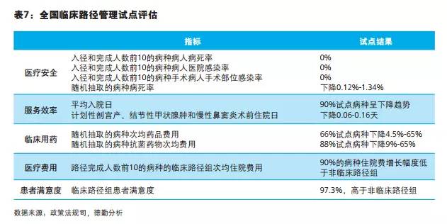相對于醫(yī)療服務(wù)流程的標準化,臨床路徑管理則是針對患者治療本身的一種質(zhì)量管理模式。基于對患者的診斷,以循證醫(yī)學為指導(dǎo),臨床路徑管理通過對某些病種的檢查、手術(shù)、治療、護理等活動的標準化和精細化來規(guī)范醫(yī)療行為,控制治療風險,提高治療效果并優(yōu)化資源利用。它起源于20世紀80年代的美國,目前已在歐美和部分亞洲國家廣泛應(yīng)用并取得了良好的效果,也被JCI列為醫(yī)院評價評審的核心標準之一。中國起步相對較晚,1998年后,國內(nèi)醫(yī)院開始嘗試少數(shù)病種的試點工作。2009年國家計生委正式啟動全國臨床路徑管理試點工作,截至2011年底,全國共有3467家醫(yī)療機構(gòu),共計25503個科室嘗試臨床路徑管理。試點工作取得顯著成效,顯示臨床路徑管理有助于保障醫(yī)療安全、提高服務(wù)效率、規(guī)范臨床用藥、控制不合理的醫(yī)療費用并提高患者滿意度(表7)。2012年10月,衛(wèi)計委發(fā)布關(guān)于“十二五”期間推進臨床路徑管理工作的指導(dǎo)意見,制定未來三年工作目標,要求到2015年末各?。▍^(qū)、市)內(nèi)所有三級醫(yī)院、80%的二級醫(yī)院應(yīng)當開展臨床路徑管理,并逐步增加臨床路徑管理專業(yè)和病種數(shù)。