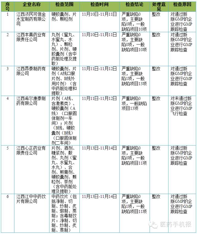 據(jù)了解,2015年11月,陜西省藥監(jiān)局組織檢查組對江西濟民可信金水寶制藥有限公司、江西本真藥業(yè)有限責任公司、江西昂泰制藥有限公司、江西心正藥業(yè)有限責任公司、江西江中中藥飲片有限公司5家藥品生產企業(yè)進行了跟蹤檢查,對江西希爾康泰制藥有限公司進行了飛行檢查。