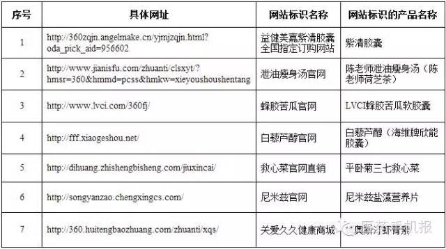 近期,國家藥監(jiān)總局監(jiān)督檢查發(fā)現(xiàn),標(biāo)識為“益健美嘉紫清膠囊全國指定訂購網(wǎng)”“泄油瘦身湯官網(wǎng)”“蜂膠苦瓜官網(wǎng)”“白藜蘆醇官網(wǎng)”“救心菜官網(wǎng)直銷”“尼米茲官網(wǎng)”“關(guān)愛久久健康商城”的7家互聯(lián)網(wǎng)站違法發(fā)布虛假信息,內(nèi)容含有不科學(xué)地宣稱治療疾病功效的斷言,以及利用學(xué)術(shù)機(jī)構(gòu)、專家、醫(yī)生、患者等名義形象作證明等問題,欺騙誤導(dǎo)消費(fèi)者,嚴(yán)重危害公眾飲食用藥安全。