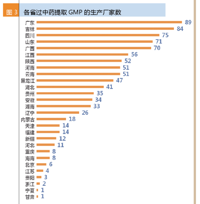 各省過中藥提取的GMP數(shù)據(jù)中:廣東廠家數(shù)最多,共89家;其次是吉林,共84家;四川、山東和廣西的廠家數(shù)都過70家。值得注意的是,華東過中藥提取GMP的廠家數(shù)并不多,浙江才2家,江蘇4家,上海0家。