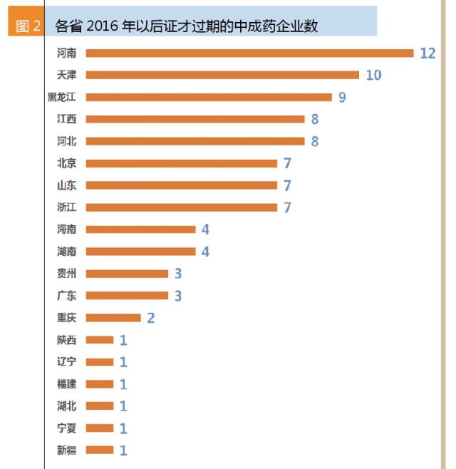 2016~2019年才過期的90家中成藥生產(chǎn)企業(yè)中,河南的企業(yè)最多,共12家;其次是天津,共10家;第三是黑龍江。一些中藥企業(yè)較多的省份都是2015年到期,如吉林、廣西和四川。即使是有著中成藥傳統(tǒng)的廣東,2016年后才過期的只有3家。