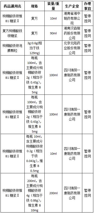 為保障公眾用藥安全,按上級部門指示,對四川省掛網(wǎng)的涉及使用不合格原料生產(chǎn)的湖南省湘中制藥有限公司等7家生產(chǎn)企業(yè)的枸櫞酸鐵銨維B1糖漿Ⅱ(復(fù)方*12支)等14個品規(guī)暫停掛網(wǎng)銷售,全省上網(wǎng)采購醫(yī)療機構(gòu)立即停止銷售和使用以上藥品。