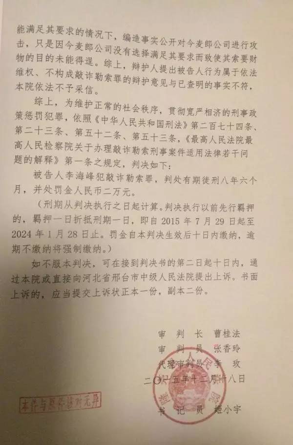 河北隆堯縣法院一審以敲詐勒索罪判處李海峰有期徒刑八年六個(gè)月,并處罰金2萬(wàn)元。