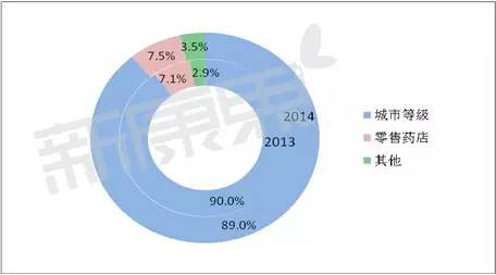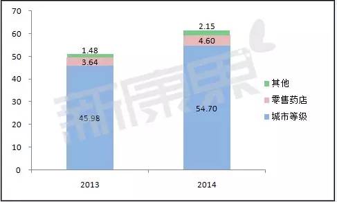 從各大終端來看,城市等級醫(yī)院單抗藥物的銷售規(guī)模占整個市場近90%,2013年和2014年分別為45.98億元和54.70億元,2014年占比較2013年略有下降;其次為零售藥店,2014年占比僅為7.5%左右;而縣域等級醫(yī)院、城市基層醫(yī)院和農(nóng)村基層醫(yī)院的2014年占比尚不足4%,僅有2.15億元。