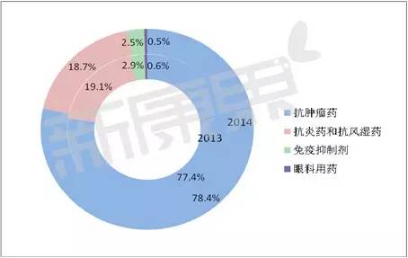 目前,單抗類藥物主要包括抗腫瘤藥、抗炎藥和抗風濕藥、免疫抑制劑及眼科用藥等,從適用科室來看,分別適用于腫瘤科、免疫風濕科、器官移植科和眼科??鼓[瘤藥是單抗市場的主體,占比近八成;抗炎藥和抗風濕藥占比近兩成;而免疫抑制劑和眼科用藥市場份額相對較小。