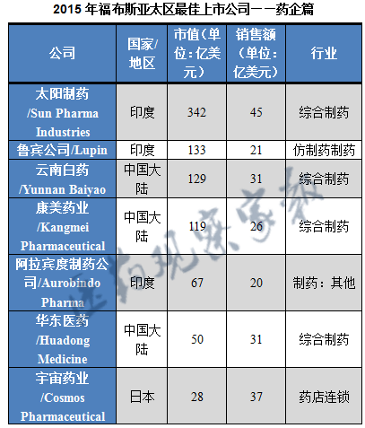 近日,福布斯中文網(wǎng)再次發(fā)布榜單——《2015年福布斯亞太區(qū)最佳上市公司50強(qiáng)》。瀏覽整個榜單,上榜的藥企共有7家,中國有華東醫(yī)藥、康美藥業(yè)、云南白藥等3家藥企上榜,印度2家,日本1家。