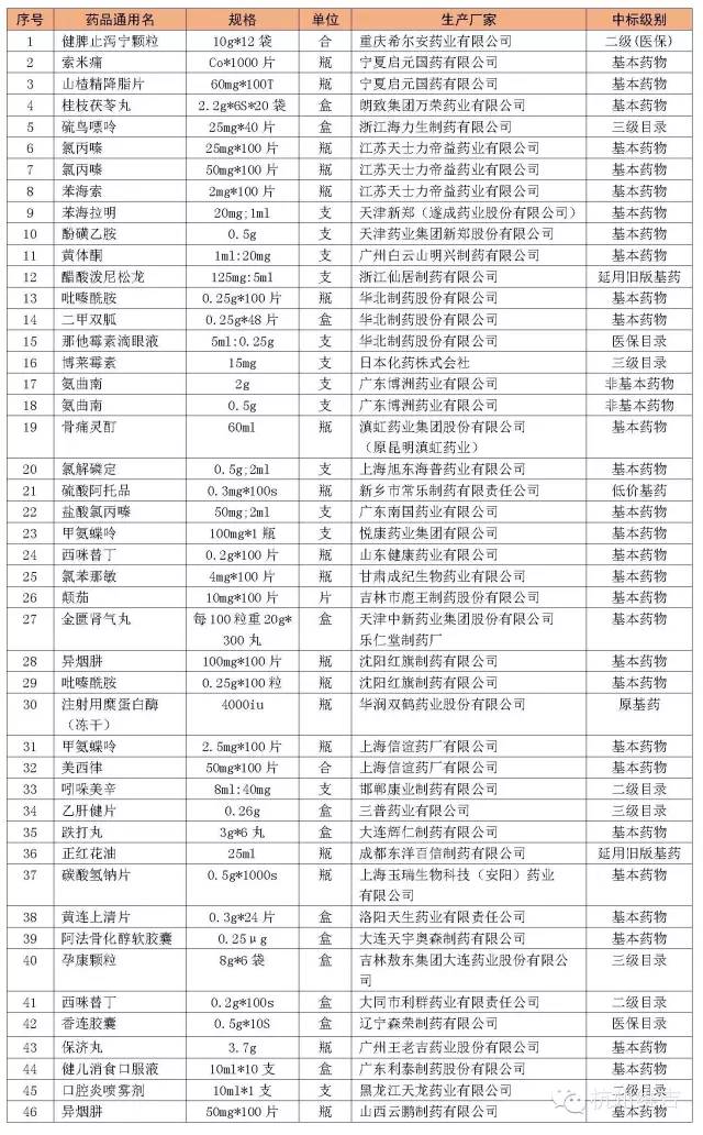 46個品規(guī)中包括 33個基藥,另外還有3個醫(yī)保品種。具體名單如下。