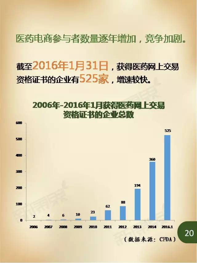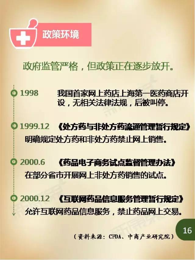 在“互聯(lián)網(wǎng)+”不斷普及和網(wǎng)購(gòu)滲透率不斷提高的浪潮中,醫(yī)藥行業(yè)也獲得了難得的發(fā)展機(jī)遇,舊有的行業(yè)格局正面臨著洗牌——醫(yī)藥電商的出現(xiàn),帶來了商業(yè)模式的變革。而以2005年第一張醫(yī)藥B2C牌照的頒發(fā)為開端,醫(yī)藥電商在我國(guó)已經(jīng)走過了10年風(fēng)雨,目前正逐漸進(jìn)入相對(duì)穩(wěn)定的發(fā)展階段。