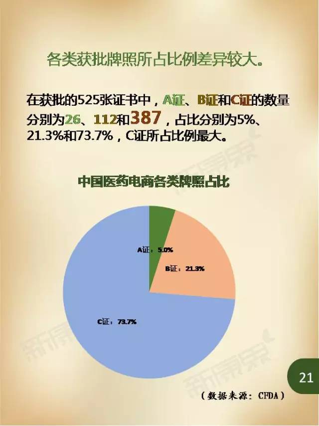 截至2016年1月31日,獲得醫(yī)藥網(wǎng)上交易資格證書的企業(yè)有525家。其中,A證、B證和C證的數(shù)量分別為26、112和387,占比分別為5%、21.3%和73.7%,C證所占比例最大。
