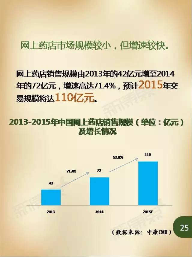 從目前來看,網(wǎng)上藥店市場(chǎng)規(guī)模雖然不算大,但增速較快。2013年,網(wǎng)上藥店銷售規(guī)模為42億元,2014年該數(shù)字為72億元,預(yù)計(jì)2015年交易規(guī)模將達(dá)110億元。