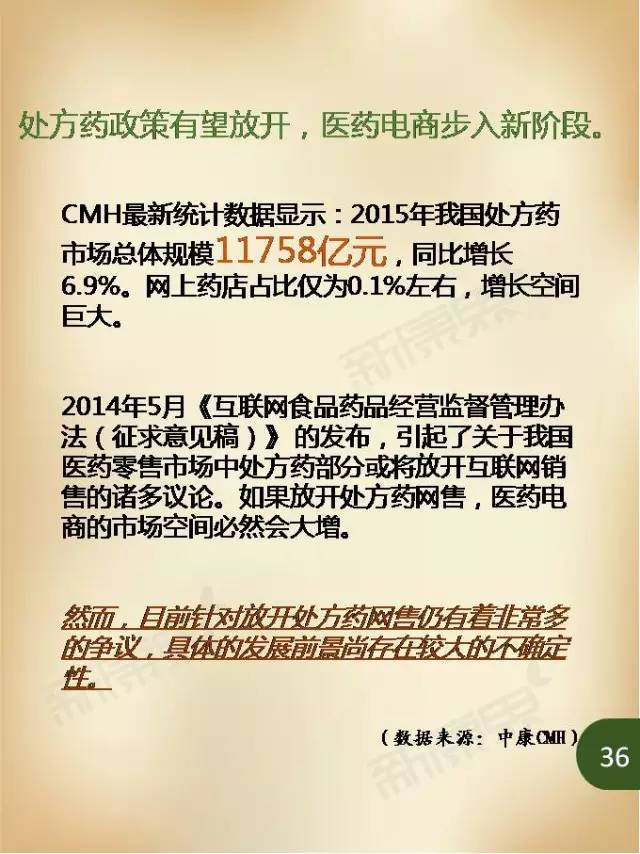 而放眼未來,隨著網(wǎng)上藥店醫(yī)保支付試點(diǎn)的推進(jìn),以及業(yè)界對(duì)于網(wǎng)售處方藥放開的期待,醫(yī)藥電商仍有巨大的發(fā)展空間。