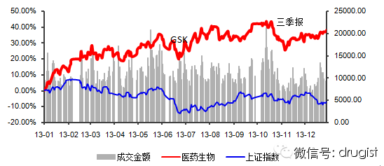 從指數(shù)的走勢來看,醫(yī)藥板塊一季度出現(xiàn)了一大波陽春行情,4月份調(diào)整后繼續(xù)向上。2013年6月,10月下旬到11月上旬,有兩段比較顯著的下跌,6月份的下跌以及隨后的震蕩主要受到GSK事件引發(fā)的工商總局打擊商業(yè)賄賂措施的影響。10月下旬的下跌主要是雙重因素疊加,行業(yè)負面消息增多、三季報普遍沒有達到投資者的預期。進入12月后,指數(shù)整體保持平穩(wěn),呈小幅上升的趨勢。