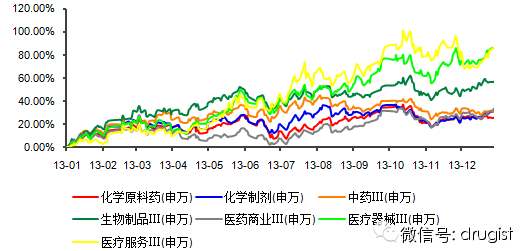 [②]分行業(yè)來看,2013年,生物制品、醫(yī)療服務、醫(yī)療器械在2013年度上漲強勁,化學原料藥、中藥、醫(yī)藥商業(yè)、化學制劑表現(xiàn)稍弱。醫(yī)療器械指數(shù)上漲85.91%,醫(yī)療服務指數(shù)上漲87.12%,生物制品指數(shù)上漲57.23%,醫(yī)藥商業(yè)上漲34.04%,中藥上漲32.33%,化學制劑上漲32.16%,原料藥上漲25.84%。