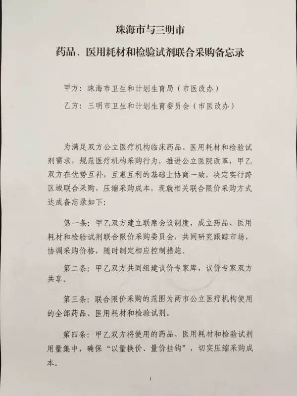 在健康三明網(wǎng)站顯示的備忘錄上,我們看到珠海與三明就藥品、醫(yī)用耗材和檢驗試劑達成聯(lián)合采購,雙方成立聯(lián)合限價采購委員會,將上述三種醫(yī)藥商品集中起來,確保以量還價、量價掛鉤。雙方將互通使用及價格信息,優(yōu)先采購?fù)|(zhì)低價的產(chǎn)品,并約定結(jié)算期限為60天。
