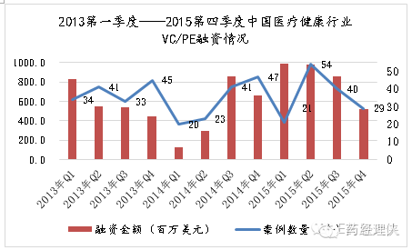 2015年度醫(yī)療健康領(lǐng)域VC/PE融資金額呈現(xiàn)出激進(jìn)上漲趨勢,醫(yī)療健康領(lǐng)域持續(xù)發(fā)力。