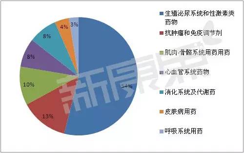 從治療領(lǐng)域來(lái)看,超過一半(41個(gè))的新藥屬于生殖泌尿系統(tǒng)和性激素類藥物,此外,抗腫瘤和免疫調(diào)節(jié)劑(10個(gè))、肌肉-骨骼系統(tǒng)用藥(8個(gè))、心血管系統(tǒng)藥物(6個(gè))和消化系統(tǒng)及代謝藥(6個(gè))數(shù)量也較多。