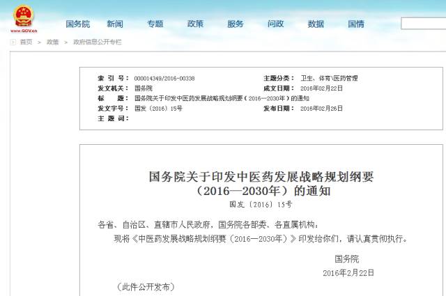 國(guó)務(wù)院正式發(fā)布《中醫(yī)藥發(fā)展戰(zhàn)略規(guī)劃綱要(2016—2030年)》