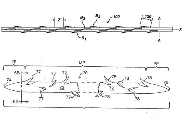 在單股線的基礎(chǔ)上切割形成倒刺線相當(dāng)于縮小了縫線的主干,勢必影響縫線本身的抗張力強(qiáng)度。為了保證縫線本身的抗張力強(qiáng)度,一種新的制作倒刺線的方法就是在單纖維線的主干上另行添加倒刺,這就是所謂的魚骨倒刺線,不過我自己還沒有使用過。