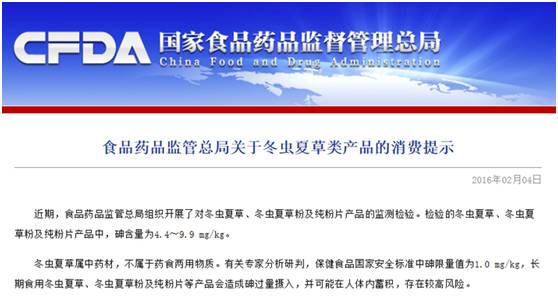 近日,國(guó)家食藥監(jiān)總局發(fā)布的“冬蟲(chóng)夏草砷超標(biāo)”這一條消息被傳得沸沸揚(yáng)揚(yáng),多家媒體均發(fā)表系列主題文章,提示大家將冬蟲(chóng)夏草藥食兩用或有風(fēng)險(xiǎn)。更有媒體為博人眼球而把冬蟲(chóng)夏草與砒霜相比較,令服用冬蟲(chóng)夏草的患者和以之作為保健品食用的人群出了一身冷汗。