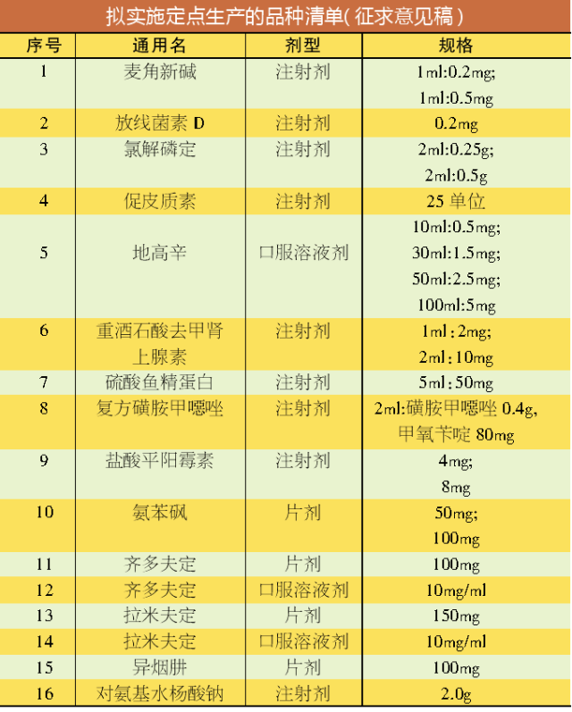 近日,《國家衛(wèi)生計(jì)生委藥政司關(guān)于擬實(shí)施定點(diǎn)生產(chǎn)藥品品種公開征求意見的函》掛網(wǎng),發(fā)布了擬實(shí)施定點(diǎn)生產(chǎn)的16種短缺藥品品種清單,以保障臨床必需、用量小、市場供應(yīng)短缺藥品的供應(yīng)。治療嬰兒痙攣癥的注射用促皮質(zhì)素、廉價腫瘤化療藥物放線菌素D,以及心臟手術(shù)必備藥品硫酸魚精蛋白注射液都在此次發(fā)布的清單之列。