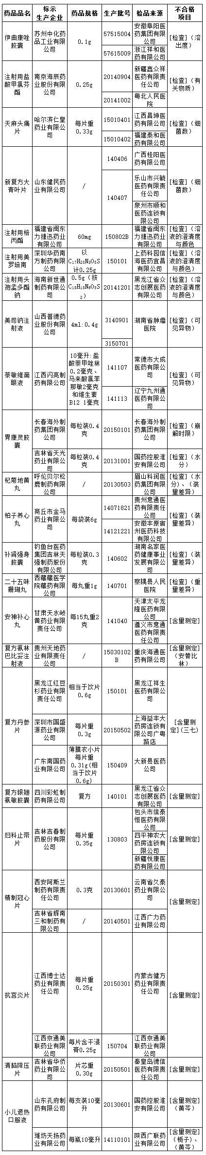 其中,被檢查不合格項目包括溶出度、有關(guān)物質(zhì)、細(xì)菌數(shù)、溶液的澄清度與顏色、可見異物、崩解時限、水分、裝量差異、重量差異和含量測定等。