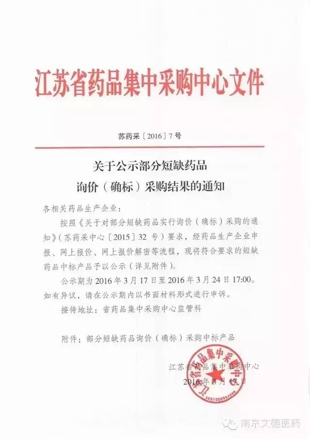 江蘇省藥品集中采購(gòu)中心關(guān)于公示部分短缺藥品詢價(jià)(確標(biāo))采購(gòu)結(jié)果的通知