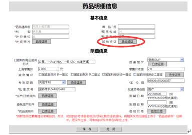 中填寫(xiě)相關(guān)資證了,只需按下“藥品明細(xì)信息”頁(yè)面中“基本信息”欄目?jī)?nèi)的“其他