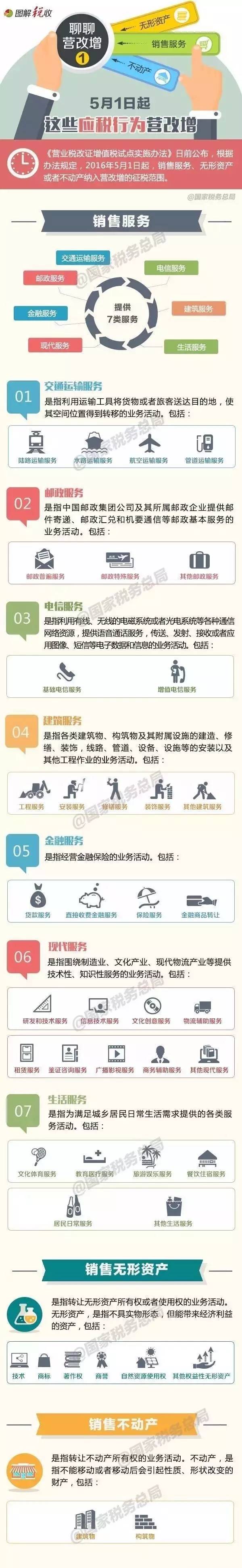 《營業(yè)稅改證增值稅試點(diǎn)實(shí)施辦法》日前公布,辦法規(guī)定,2016年5月1日起,銷售服務(wù)、無形資產(chǎn)或者不動(dòng)產(chǎn)納入營改增的征稅范圍。具體包括哪些應(yīng)稅行為,戳圖了解↓