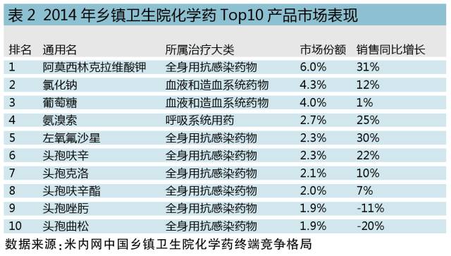 從化藥Top 10品種分布看,農(nóng)村基層抗菌藥仍是主打,此外就是氯化鈉、葡萄糖等大輸液品種。排名首位的阿莫西林克拉維酸鉀2014年同比增長超過30%,顯示出其在農(nóng)村市場仍有很大的拓展空間。單從全身用抗菌藥物的使用結(jié)構(gòu)來看,在城市醫(yī)院銷售排名首位的哌拉西林他唑巴坦在鄉(xiāng)鎮(zhèn)衛(wèi)生院市場Top 10品種中不見蹤影;而在城市醫(yī)院銷售排不進(jìn)前十的阿莫西林克拉維酸鉀在鄉(xiāng)鎮(zhèn)衛(wèi)生院排名首位,這種藥物已經(jīng)徹底下沉至基層終端市場。其他如頭孢克洛、頭孢呋辛酯、頭孢唑肟、頭孢曲松等上一代頭孢品種在城市醫(yī)院中已經(jīng)排不進(jìn)前十,但在鄉(xiāng)鎮(zhèn)衛(wèi)生院中仍占有重要地位。左氧氟沙星、頭孢呋辛兩種藥物無論在城市醫(yī)院還是鄉(xiāng)鎮(zhèn)衛(wèi)生院均排在全身用抗菌藥物銷售額前三品種位置,這兩個(gè)品種無論療效還是渠道的鋪貨均得到市場肯定。