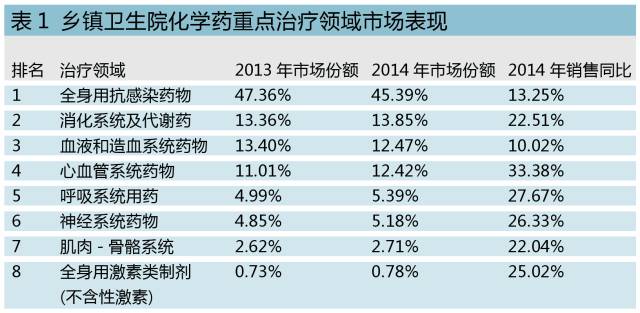 鄉(xiāng)鎮(zhèn)衛(wèi)生院中全身用抗感染藥物占據(jù)半壁江山。這類基層醫(yī)療機(jī)構(gòu)一方面醫(yī)療水平有限,治病仍舊以傳統(tǒng)的“三素一湯”為主;另一方面,農(nóng)村居民對鄉(xiāng)鎮(zhèn)基層醫(yī)療機(jī)構(gòu)信心有限,慢性疾病的在基層醫(yī)療機(jī)構(gòu)作常規(guī)治療的習(xí)慣還需要進(jìn)一步培養(yǎng)。從未來的大趨勢看,鄉(xiāng)鎮(zhèn)衛(wèi)生院的用藥結(jié)構(gòu)將逐步與城市社區(qū)靠近。
