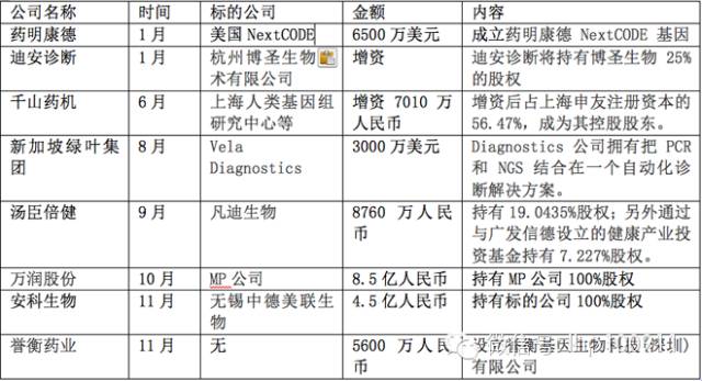 2015年,不僅成立了數(shù)量眾多的基因公司,并且,發(fā)生了多起收購(gòu)事件,收購(gòu)的目的主要是切入基因行業(yè)或搶占地盤(pán)。其中比較重大的收購(gòu)包括藥明康德、千山藥機(jī)、迪安診斷、綠葉集團(tuán)、湯臣倍健、萬(wàn)潤(rùn)股份、安科生物、譽(yù)衡藥業(yè)。這些公司中,很多都是轉(zhuǎn)型到基因產(chǎn)業(yè),玩家眾多表明各方十分看好基因產(chǎn)業(yè)的發(fā)展前景。