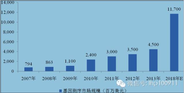 2007-2018年全球基因測(cè)序市場(chǎng)規(guī)模圖: