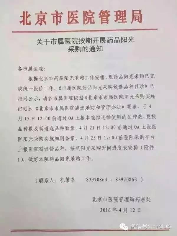 上述文件為北京市醫(yī)院管理局昨日的通知,據(jù)MRCLUB網(wǎng)友提供另一份北京市醫(yī)院管理局今日再發(fā)的一份通知顯示,要求各醫(yī)院須于本月15日12:00前通過OA上報本院擬連續(xù)使用的品種數(shù)、更換品種數(shù)及新遴選品種數(shù)量,4月21日12:00前通過OA上報醫(yī)院陽光采購實(shí)施細(xì)則備案,4月25日12:00前登陸采購平臺上報醫(yī)院需議價品種,按照陽光采購進(jìn)度表安排,做好本院藥品陽光采購工作。