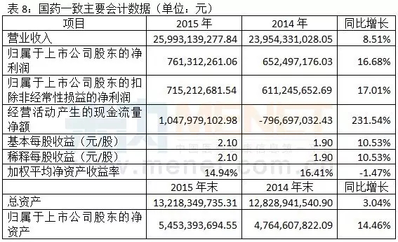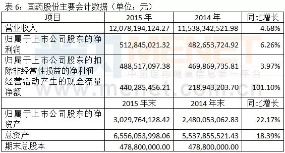 2015年,國藥股份實現(xiàn)營業(yè)收入120.78億元,同比增長4.68%,利潤總額6.68億元,同比增長6.85%,歸屬于母公司凈利潤5.13億元,同比上升6.26%。