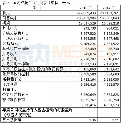 2015年國藥控股收入2270.69億元,同比增加13.46%,主要由于醫(yī)藥分銷業(yè)務(wù)及醫(yī)藥零售業(yè)務(wù)的提升。