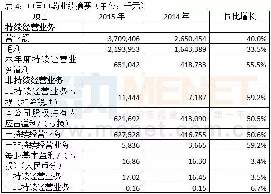 中國中藥在完成收購天江藥業(yè)87.3%股權(quán)后,于2015年10月開始合并其財務(wù)報表,截止只2015年12月31日,天江藥業(yè)貢獻營業(yè)額約978,892,000元。此外,鑒于已完成出售貴州中泰生物科技有限公司及其附屬公司(貴州中泰)大部分股權(quán),將不再按去年合并其營業(yè)額至持續(xù)經(jīng)營業(yè)務(wù)中,而將其調(diào)整至非持續(xù)經(jīng)營業(yè)務(wù)中。