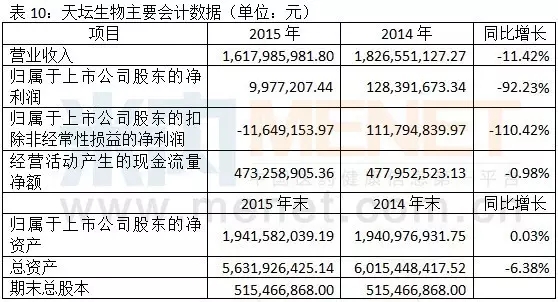 2015年天壇生物營業(yè)收入1,617,985,981.80元,同比下降11.42%;實現(xiàn)營業(yè)利潤181,776,281.15元,同比下降36.20%;實現(xiàn)歸屬于母公司所有者的凈利潤9,977,207.44元,同比下降92.23%。業(yè)績下滑是因為受整體搬遷和麻腮風系列產(chǎn)品自檢重試評估致產(chǎn)出率下降以及亦莊新廠房投入生產(chǎn),能源費用、折舊費用上升等因素的影響,公司經(jīng)營業(yè)績整體降幅較大。