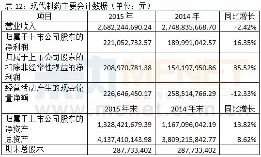 2015年現(xiàn)代制藥營業(yè)總收入268,224.47萬元,同比下降2.42%,實現(xiàn)利潤總額35,262.70萬元,同比增長18.67%,歸屬于母公司所有者的凈利潤22,105.27萬元,同比增長16.35%。