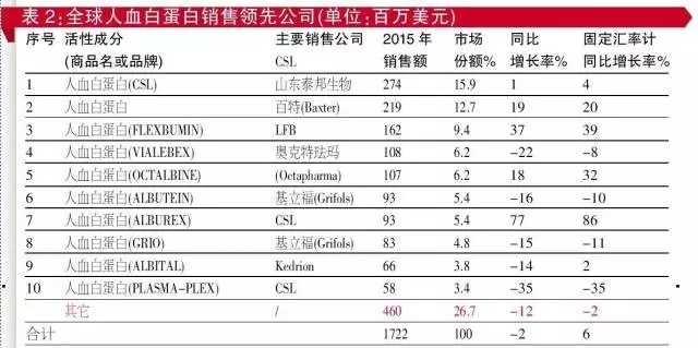 據(jù)統(tǒng)計,2014年10月至2015年9月,按制劑出廠金額計,全球人血白蛋白市場規(guī)模約為17億美元,中國人血白蛋白市場規(guī)模為5.7億美元,同比增長12%,是全球人血白蛋白市場規(guī)模最大的國家;美國居第二位,達2.7億美元,同比增長6%。全球人血白蛋白銷售領先公司見表2??上驳氖牵?/span>山東泰邦生物制品有限公司在全球人血白蛋白銷售領先公司之列,并居第二位。