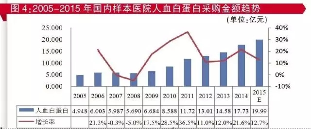 據(jù)PDB數(shù)據(jù),預計2015年樣本醫(yī)院人血白蛋白采購金額合計約為20億元,占血液制品采購金額的57%,比例日趨合理(2005年占比為66.4%)。從樣本醫(yī)院2005-2015年人血白蛋白采購金額趨勢圖中看出(見圖4),2012-2015年3年間樣本醫(yī)院人血白蛋白采購金額年復合增長率為15.4%。
